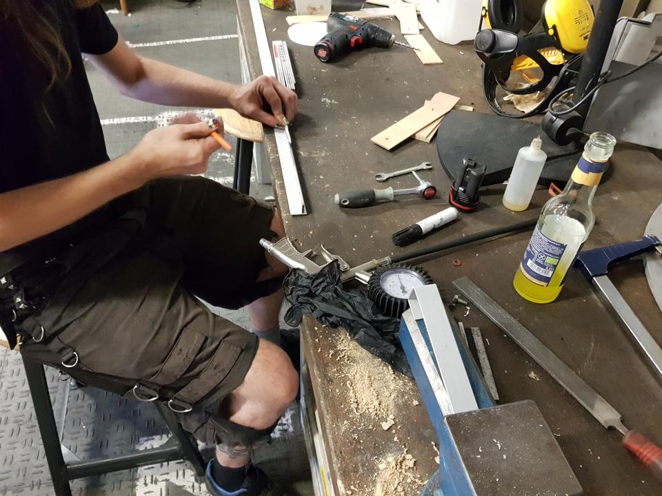 Wir haben uns entschieden, die Erweiterung des Waste-Busters, das ist der Bollerwagen, den wir zum Muellsammelnmitnehmen, im zwanzig° zu bauen, denn dort koennen wir in Ruhe werkeln und haben einen funktionierenden Schraubstock - was an der Waste-Buster-Base nicht so einfach ist.