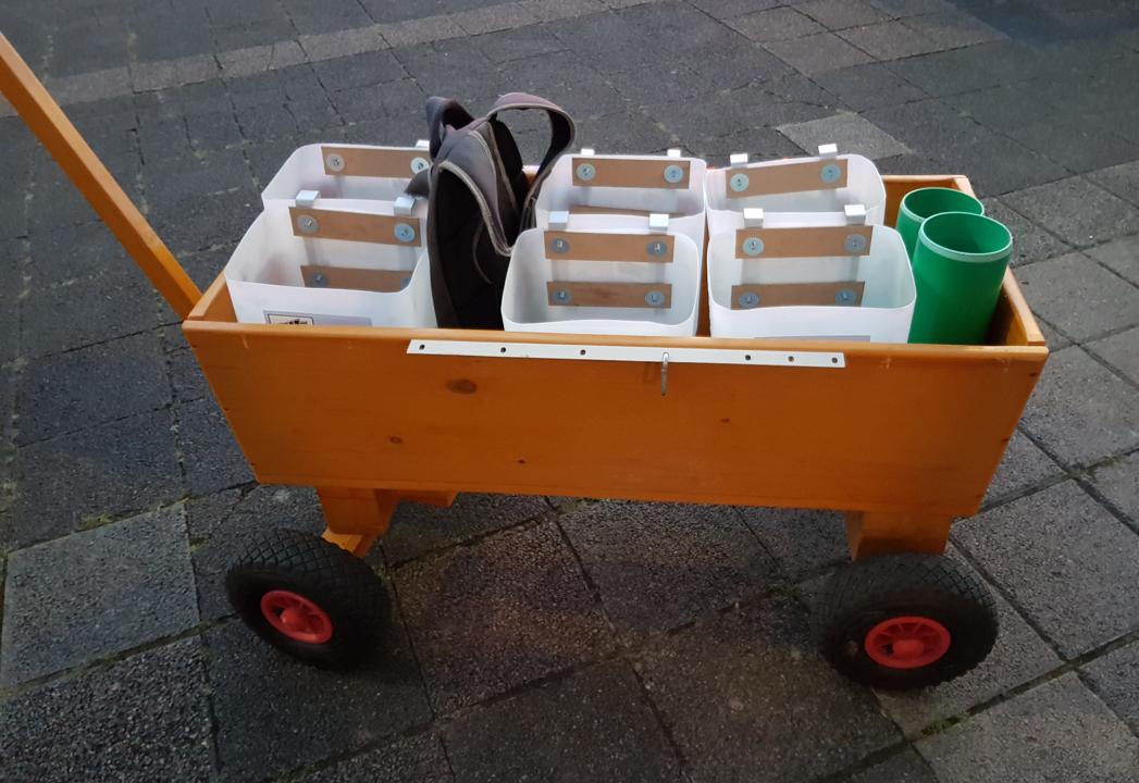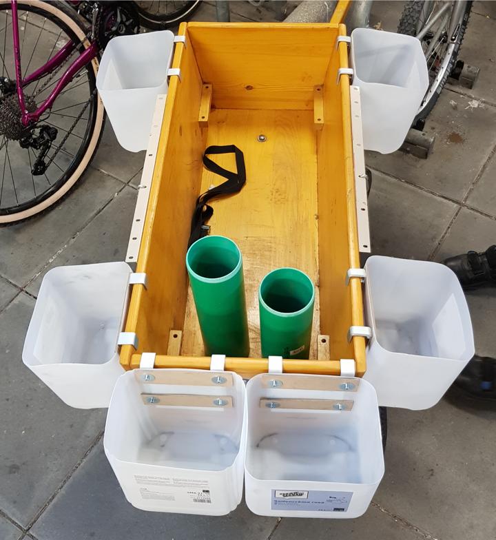 Die Erweiterung besteht aus 6 10-Liter-Kanistern, in denen vorher Fluessigseife transportiert wurde und die in der Uni regelmaessig weggeworfen werden. Diese sollen mit Haken versehen werden, um sie dann an der Bordwand des Bollerwagens einhaengen zu koennen.